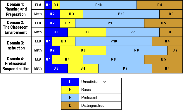 Domain 1: Planning and Preparation Domain 2: The Classroom Enviroment Domain 3: Instruction Domain 4: Professional Responsibilities E L A Math E L A Math E L A Math E L A Math Unsatisfactory 1 2 2 3 1 2 1 3 Basic 1 3 2 5 3 6 4 4 Proficient 10 10 9 7 10 8 8 7 Distinguished 6 3 5 3 4 2 5 4 Chart showing the teacher Observation summary data from last year with the number of teachers scoring at each level of performance on the teacher practice rubric in domain one planning and preparation in e l a there was one unsatisfactory one basic ten proficient and six distinguished in math there were two unsatisfactory three basic ten proficient and three distinguished in domain two the classroom environment in e l a there were two unsatisfactory two basic nine procient and five distinguished in math there were three unsatisfactory five basic seven proficient and three distinguished in domain three instruction in e l a there was on unsatisfactory three basic ten proficient and four distinguished in math there were two unsatisfactory six basic eight proficient and two distinguished in domain four professional responsibilities in e l a there was one unsatisfactory four basic eight proficient and five distinguished in math there were three unsatisfactory four basic seven proficient and four distinguished