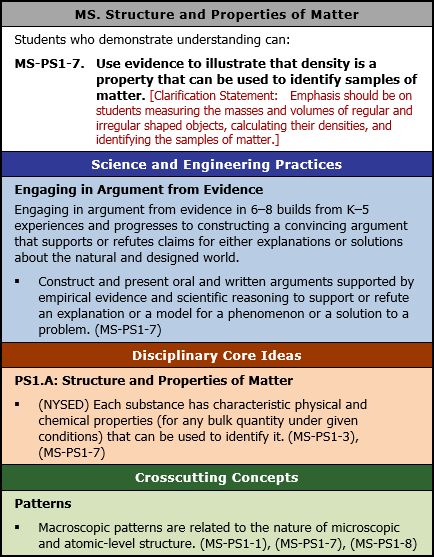 MS-PS1-7. Use evidence to illustrate that density is a property that can be used to identify samples of matter. [Clarification Statement: Emphasis should be on students measuring the masses and volumes of regular and irregular shaped objects, calculating their densities, and identifying the samples of matter.]