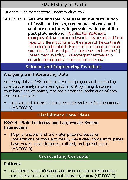 MS-ESS2-3. Analyze and interpret data on the distribution of fossils and rocks, continental shapes, and seafloor structures to provide evidence of the past plate motions. [Clarification Statement: Examples of data could include similarities of rock and fossil types on different continents, the shapes of the continents (including continental shelves), and the locations of ocean structures (such as ridges, fracture zones, and trenches).] [Assessment Boundary: Paleomagnetic anomalies in oceanic and continental crust are not assessed.]
