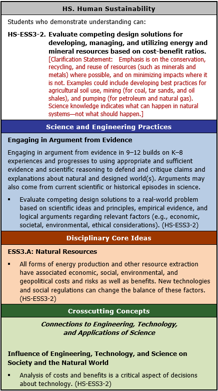 HS-ESS3-2. Evaluate competing design solutions for developing, managing, and utilizing energy and mineral resources based on cost-benefit ratios. [Clarification Statement: Emphasis is on the conservation, recycling, and reuse of resources (such as minerals and metals) where possible, and on minimizing impacts where it is not. Examples could include developing best practices for agricultural soil use, mining (for coal, tar sands, and oil shales), and pumping (for petroleum and natural gas). Science knowledge indicates what can happen in natural systems—not what should happen.]