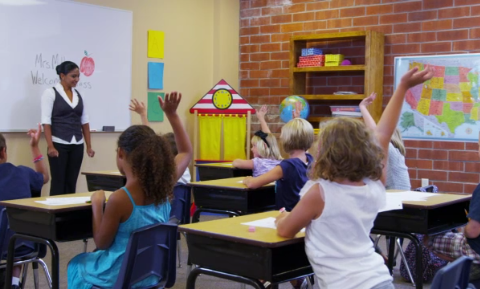Third grade classroom the teacher is standing at the
